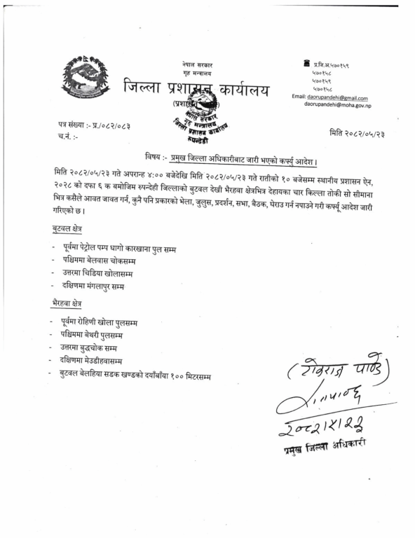 जिल्ला प्रशासन कार्यालय रुपन्देहीले सोमबार दिनको ४ बजेदेखि आज राति १० बजेसम्म बुटवल देखि भैरवा क्षेत्र भित्र कर्फ्यु आदेश जारी गरेको हो ।