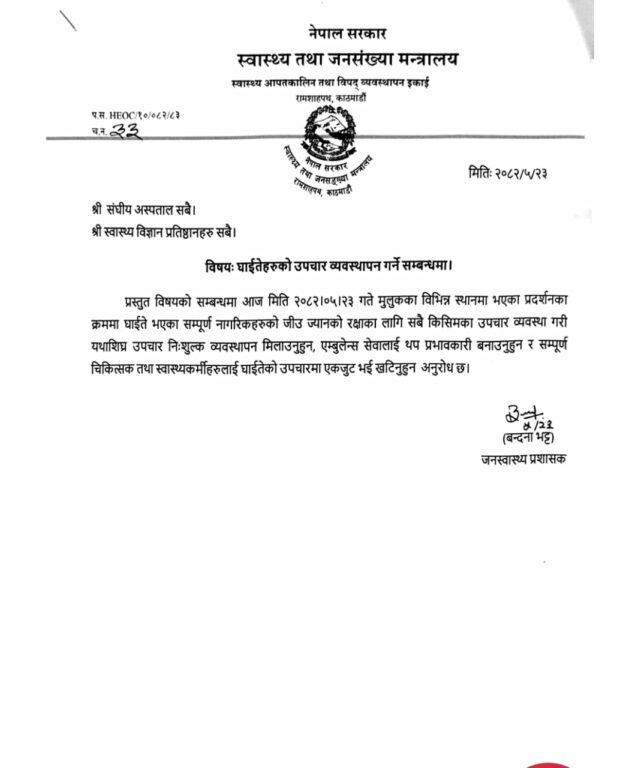 साथै, सम्पूर्ण चिकित्सक एवम् स्वास्थ्यकर्मीहरूलाई एकजुट भई घाइतेको उपचारमा जुट्न पनि मन्त्रालयले आह्वान गरेको छ ।