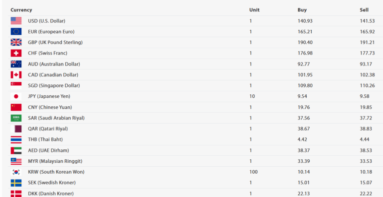 काठमाडौं । नेपाल राष्ट्र बैंकले आजका लागि विदेशी मुद्राको विनिमयदर निर्धारण गरेको छ । राष्ट्र बैंकका अनुसार अमेरिकी डलर एकको खरिददर १४० रुपैयाँ ९३ पैसा र बिक्रीदर १४१ रुपैयाँ ५३ पैसा निर्धारण गरिएको छ ।