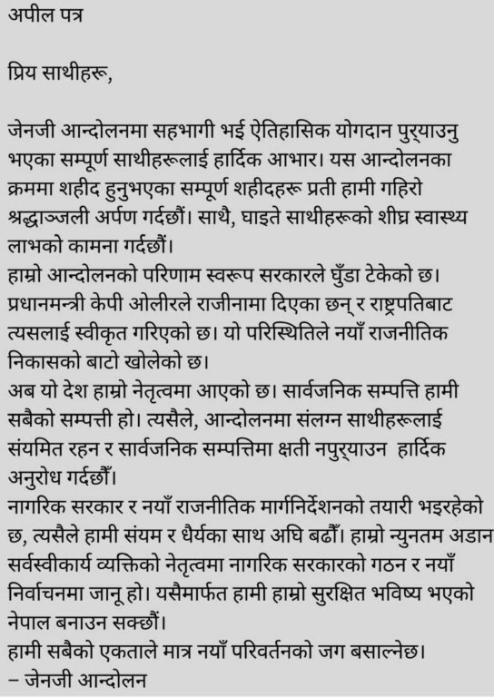 ‘नागरिक सरकार र नयाँ राजनीतिक मार्गनिर्देशनको तयारी भइरहेको छ, त्यसैले हामी संयम र धैर्यका साथ अघि बढौँ । हाम्रो न्यूनतम अडान सर्वस्वीकार्य व्यक्तिको नेतृत्वमा नागरिक सरकारको गठन र नयाँ निर्वाचनमा जानु हो । यसैमार्फत हामी हाम्रो सुरक्षित भविष्य भएको हो,’ सार्वजनिक अपीलमा भनिएको छ ।