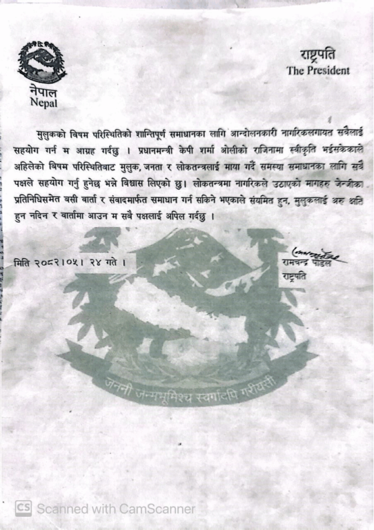 देशको विषम परिस्थितिलाई ध्यानमा राख्दै मुलुकलाई थप क्षति हुन नदिन राष्ट्रपति पौडेलले वार्तामा आउन आग्रह गरेका हुन् ।