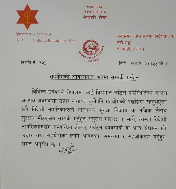 सेनाले आज बुधबार जारी गरेको विज्ञप्ति अनुसार, आवश्यक सहयोगका लागि विदेशी नागरिकहरुले नजिकको सुरक्षा निकाय वा तैनाथ सुरक्षाकर्मीहरुसँग सम्पर्क गर्नुपर्नेछ। साथै, सम्बन्धित होटल, पर्यटन व्यवसायी वा अन्य संघसंस्थाले पनि उद्धार तथा सहयोगको लागि आवश्यक समन्वय र सहजीकरण गर्नु पर्ने उल्लेख गरिएको छ ।