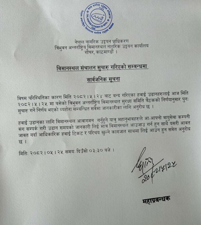 त्रिभुवन अन्तर्राष्ट्रिय विमानस्थल कार्यालयले यसअघि अपराह्न २ः३० बजे एक सूचना जारी गर्दै अर्को सूचना जारी नभएसम्मका लागि भन्दै विमानस्थल बन्द गरेको थियो ।