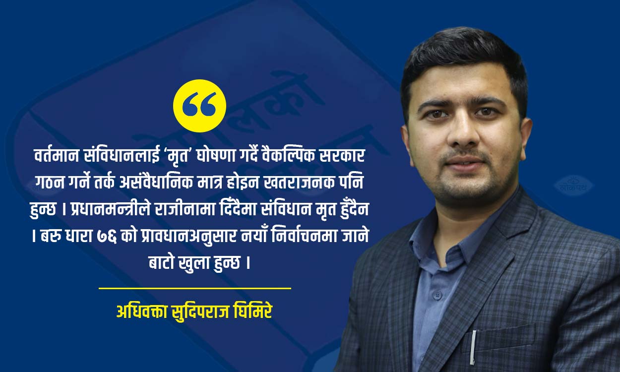 त्यसैले संविधानको प्रावधान विपरीत प्रधानमन्त्री नियुक्त गर्ने कुनै आधार रहँदैन । वर्तमान संविधानलाई ‘मृत’ घोषणा गर्दै वैकल्पिक सरकार गठन गर्ने तर्क असंवैधानिक मात्र होइन खतराजनक पनि हुन्छ । प्रधानमन्त्रीले राजीनामा दिँदैमा संविधान मृत हुँदैन । बरु धारा ७६ को प्रावधानअनुसार नयाँ निर्वाचनमा जाने बाटो खुला हुन्छ । संविधानको अवसानको बहानामा वैकल्पिक सरकार गठन गर्ने तर्क असंवैधानिक हुन्छ । संविधानलाई बेवास्ता गरेर बनेको सरकार कानुनी हैसियतविहीन हुन्छ ।