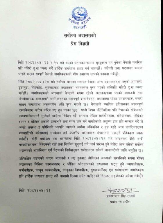 भदौ २४ को जेनजी आन्दोलनको मारमा परेको सर्वोच्च अदालतमा सबै फाइलहरु जलेर नष्ट भएका छन् । केही बँचेका फाइलहरु आगजनी र भौतिक क्षति हुन नदिन खट्ने न्यायाधीश, कर्मचारी, कानुन व्यवसायीहरु, कानुनका विद्यार्थी, सुरक्षाकर्मी लगायत सबैलाई धन्यवाद ज्ञापन गर्दै आगामी दिनमा समेत सहयोगको अपेक्षा गरिएको बताइएको छ ।