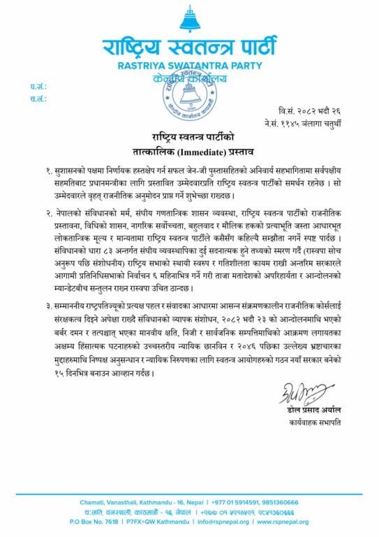 ‘नेपालको संविधानको मर्म, संघीय गणतान्त्रिक शासन व्यवस्था, राष्ट्रिय स्वतन्त्र पार्टीको राजनीतिक प्रस्तावना, विधिको शासन, नागरिक सर्वोच्चता, बहुलवाद र मौलिक हकको प्रत्याभूति जस्ता आधारभूत लोकतान्त्रिक मूल्य र मान्यतामा राष्ट्रिय स्वतन्त्र पार्टीले कसैसँग कहिल्यै सम्झौता नगर्ने स्पष्ट पार्दछ । संविधानको धारा ८३ अन्तर्गत संघीय व्यवस्थापिका दुई सदनात्मक हुने तथ्यको स्मरण गर्दै (रास्वपा सोच अनुरूप पछि संशोधनीय) राष्ट्रिय सभाको स्थायी स्वरुप र गतिशीलता कायम राखी अन्तरिम सरकारले आगामी प्रतिनिधिसभाको निर्वाचन ६ महिनाभित्र गर्ने गरी ताजा मतादेशको अपरिहार्यता र आन्दोलनको म्यान्डेटबीच सन्तुलन राख्न रास्वपा उचित ठान्दछ,’ विज्ञप्तिमा भनिएको छ ।
