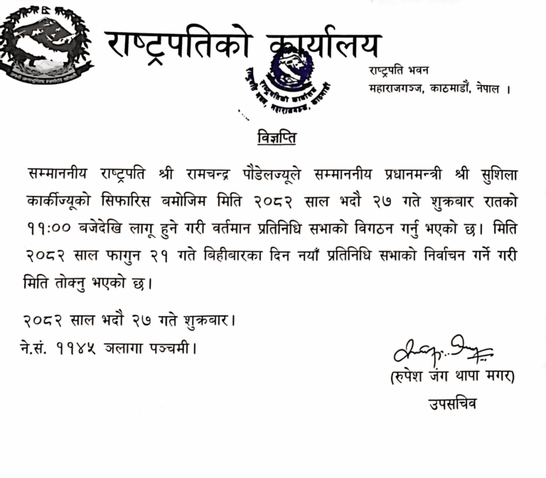 प्रधानमन्त्री सुशिला कार्कीको सिफारिसमा राष्ट्रपति रामचन्द्र पौडेलले प्रतिनिधि सभा विघटनको घोषणा गरेका हुन् ।