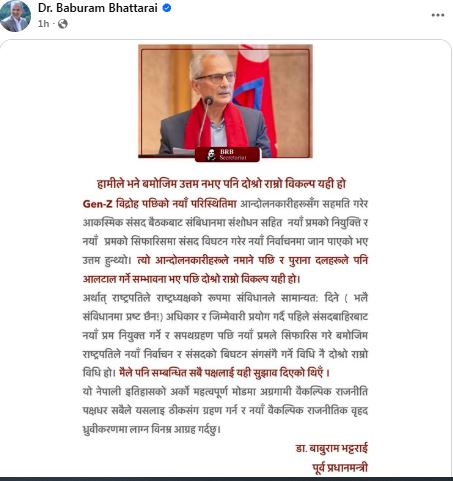 काठमाडौं । पूर्वप्रधानमन्त्री तथा नेपाल समाजवादी पार्टी (नयाँ शक्ति) का अध्यक्ष बाबुराम भट्टराईले नयाँ सरकार गठन र संसद् विघटनलाई वर्तमान परिस्थितिमा ‘दोस्रो राम्रो विकल्प’ भएको बताएका छन् ।