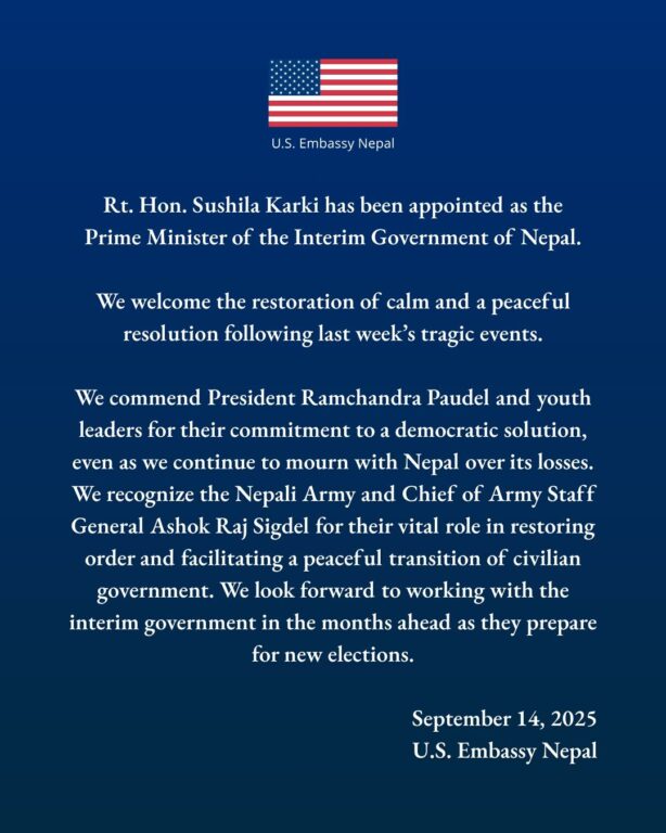 काठमाडौं । अमेरिकाले नेपालमा अन्तरिम सरकार गठनको स्वागत गरेको छ । काठमाडौंस्थित अमेरिकी दूतावासले आज आइतबार ( विज्ञप्ति जारी गर्दै लोकतान्त्रिक समाधानप्रतिको प्रतिबद्धताका निम्ति राष्ट्रपति रामचन्द्र पौडेल र युवा नेताको प्रशंसा गरेको छ ।