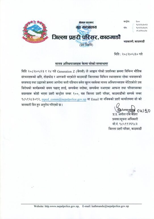 जिल्ला प्रहरी परिसर काठमाडौंले जलेको अवस्थामा मानव अस्थिपञ्जर फेला परेको र त्यसको पहिचान हुन नसकेको भन्दै सहयोगका लागि अपिल गरेको छ । जिल्ला प्रहरी परिसर काठमाडौंका सूचना अधिकारी एसपी अपिलराज बोहराले विज्ञप्ति जारी गर्दै ती अस्थिपञ्जरको पहिचानका लागि सहयोग गरिदिन आग्रह गरेका छन् ।
