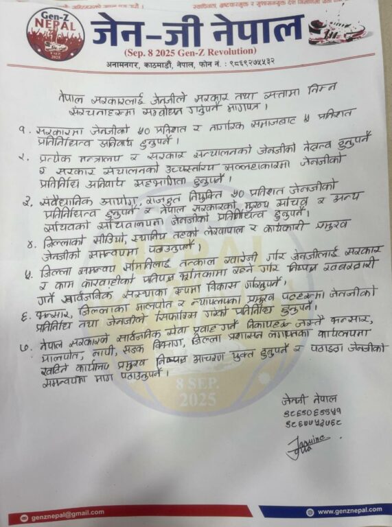जेन–जी नेपालको नामबाट जस्मिन आफैले हस्ताक्षर गरेर बुझाएको माग पत्रमा सरकारमा जेन–जीको तर्फबाट ५० प्रतिशत र नागरिक समाजको तर्फबाट ५ प्रतिशत सहभागिता माग गरिएको छ ।
