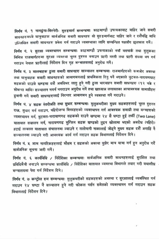 त्यस्तै, नारायणगढ–मुग्लिङ सडकको तुइन खोलामा पहिरो हटाइने, तातोपानी नाकासँग जोड्ने मुख्य सडक दसैँअघि सञ्चालनमा ल्याउने, र सडक अवस्था र मौसम अनुसार सार्वजनिक सूचना जारी गर्ने व्यवस्था पनि बैठकले तय गरेको छ ।