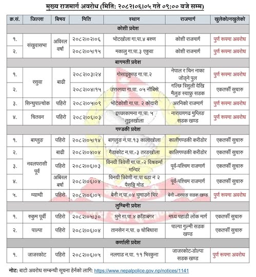 त्यस्तै, कर्णाली प्रदेशको जाजरकोट, नलगाड-११ भिरकुनामा सडक पूर्ण रूपमा बन्द छ भने रुकुमपूर्व, भुमे-४ काँडाबगर र लुम्बिनी प्रदेशअन्तर्गत तानसेनको धोविधारामा सडक एकतर्फी सञ्चालन भइरहेको प्रहरीले जनाएको छ ।