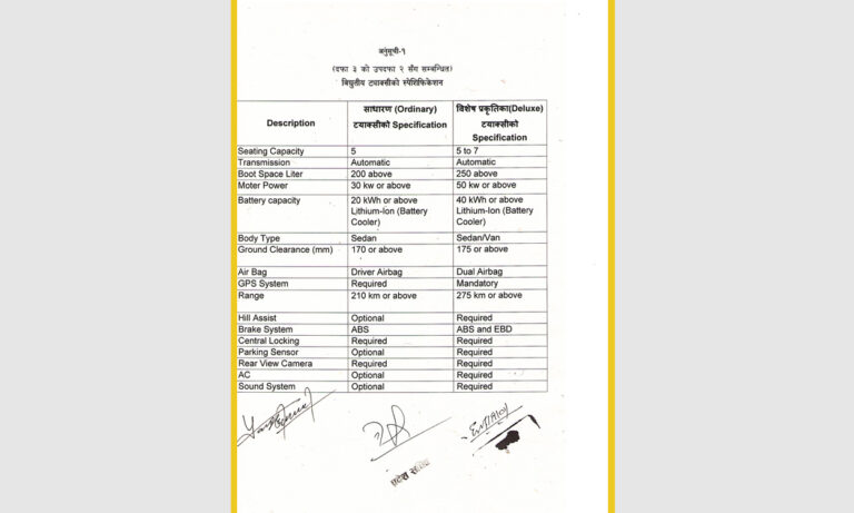 उक्त मापदण्डमा नयाँ ट्याक्सी दर्ता गर्दा अब पेट्रोलबाट चल्ने नभई विद्युतीय ट्याक्सी नै हुनुपर्ने, ट्याक्सी ल्याउँदा सेडान अर्थात् पछाडिका भागमा सामान राख्न मिल्ने प्रकृतिको हुनुपर्ने, कम्तीमा ट्याक्सीको ड्राइभिङ सिटमा सुरक्षाका लागि एयर ब्याग हुनुपर्ने लगायतका बाध्यकारी व्यवस्था गरिएको थियो ।