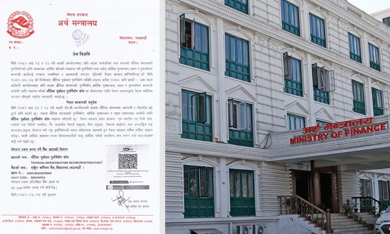 ‘मिति २०८२ भाद्र २३ र २४ गते भएको जेनजी आन्दोलनको क्रममा भौतिक संरचनामा आगजनी र तोडफोड भई ठूलो क्षति भएको छ । त्यस्ता भौतिक संरचनाको पुनर्निर्माण, आर्थिक पुनरुत्थान र राहत लगायतका कार्यको लागि भौतिक पूर्वाधार पुनर्निर्माण कोष स्थापना गरिएको छ । नेपाल सरकार, प्रदेश सरकार एवं स्थानीय तह, निजी क्षेत्र, स्वदेश तथा विदेशी नागरिक, गैरआवासीय नेपाली समुदाय, मित्र राष्ट्रहरु, विकास साझेदार तथा अन्तर्राष्ट्रिय संघ संस्थाबाट अमूल्य योगदान गरी राष्ट्र पुनर्निर्माणको महान अभियानमा सहभागी भई नेपाल सरकार सबैमा हार्दिक आह्वान गर्दछ । यस्तो आर्थिक सहायता रकम योगदानकर्ताको चालु आर्थिक वर्षको करयोग्य आय गणना गर्दा घटानउ–खर्च कट्टी गर्न पाइने,’ जारी विज्ञप्तिमा भनिएको छ ।