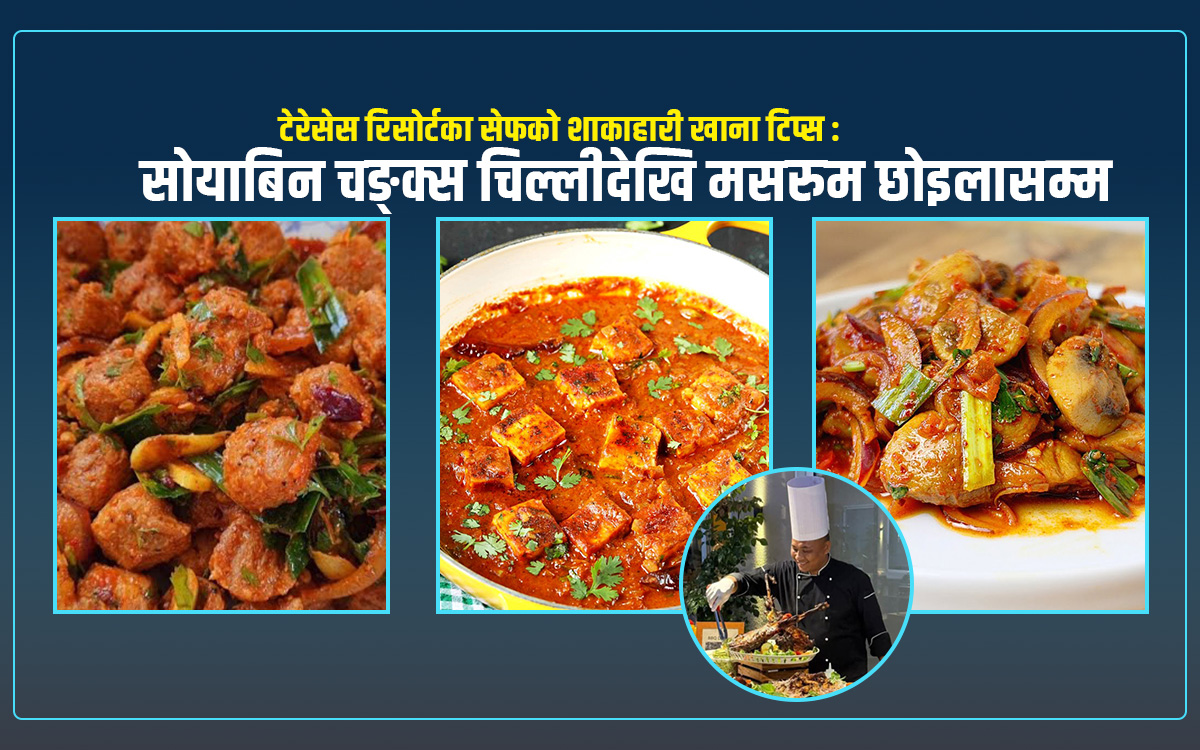 प्रोटिनका लागि मासु ठूलो स्रोत भए पनि शाकाहारी खानामा समेत प्रोटिन उत्तिकै मात्रामा पाउन सकिन्छ । शाकाहारी खाना मन पराउने मानिसका लागि दसैँमा केही उपयुक्त परिकारहरू रहेको द टेरेसेस रिसोर्ट एन्ड स्पा, लाँकुरी भन्ज्याङका सेफ सोपित लामा बताउँछन् । उनका अनुसार, नेपाली स्वादमै सरल र सजिलो तरिकाले विभिन्न प्रकारका स्न्याक्स बनाउन सकिन्छ ।