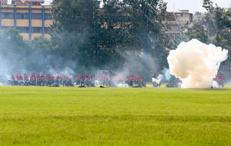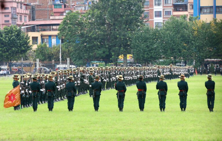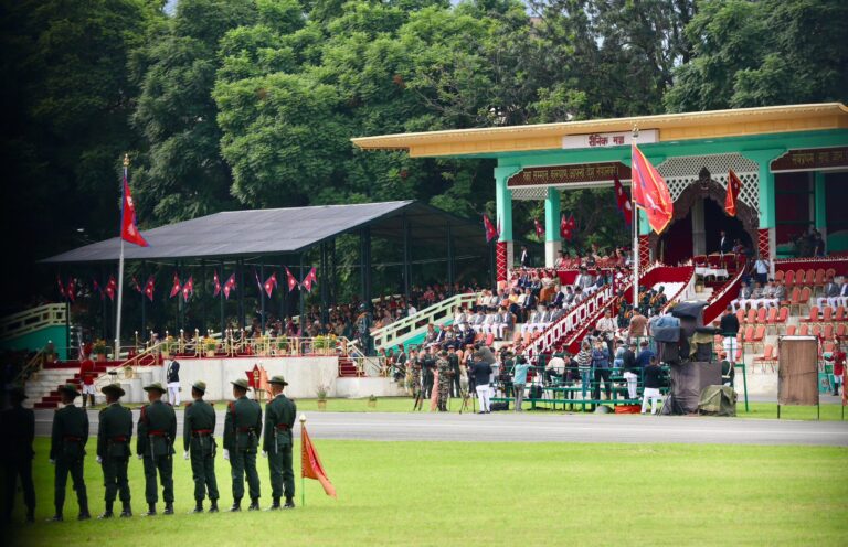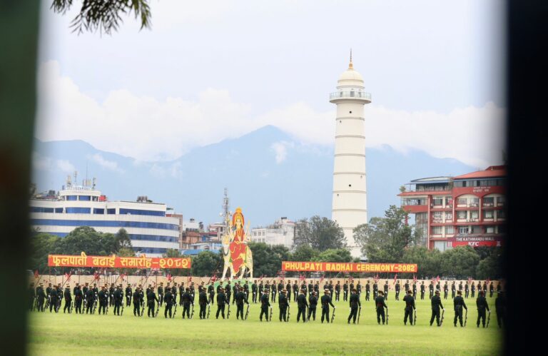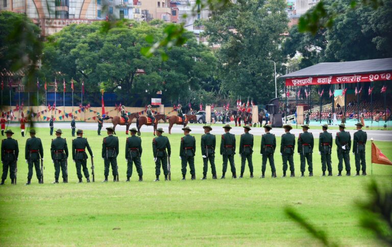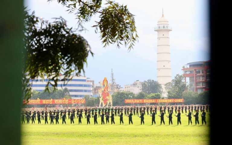 काठमाडौं । राष्ट्रपति रामचन्द्र पौडेलको प्रमुख आतिथ्यमा सैनिक मञ्च टुँडिखेलमा आज अपराह्न ‘फूलपाती बढाइँ समारोह-‘२०८२’ सम्पन्न गरिएको छ । समारोहमा नेपाली सेनाका परमाधिपति राष्ट्रपति पौडेलको सम्मानमा नेपाली सेनाले सलामी अर्पण गरेको थियो ।