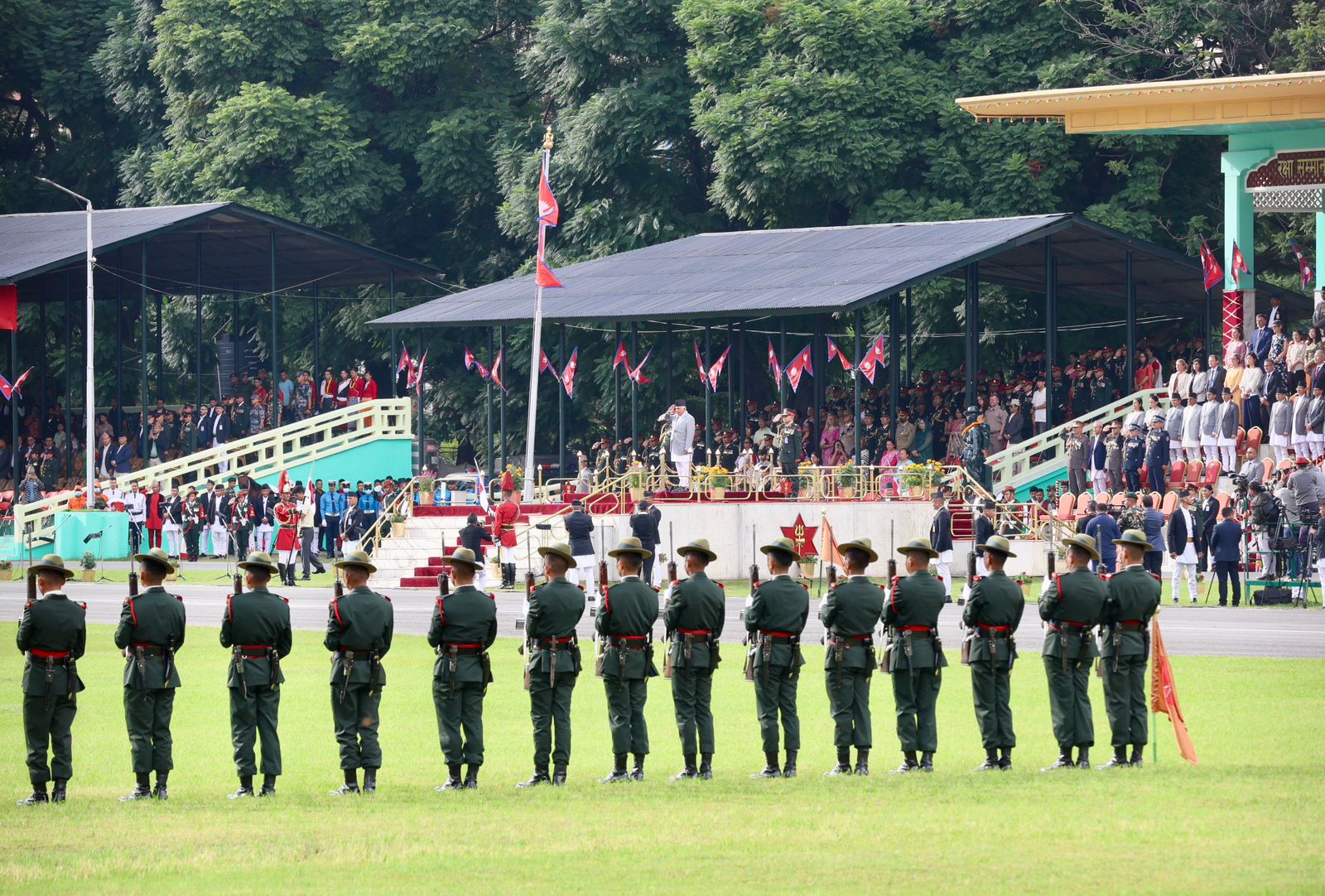 काठमाडौं । राष्ट्रपति रामचन्द्र पौडेलको प्रमुख आतिथ्यमा सैनिक मञ्च टुँडिखेलमा आज अपराह्न ‘फूलपाती बढाइँ समारोह-‘२०८२’ सम्पन्न गरिएको छ । समारोहमा नेपाली सेनाका परमाधिपति राष्ट्रपति पौडेलको सम्मानमा नेपाली सेनाले सलामी अर्पण गरेको थियो ।