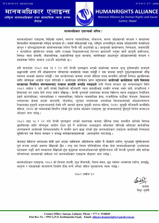 एलाइन्सले भनेको छ, ‘जेनजी पुस्ताद्वारा भएको प्रदर्शनका क्रममा भौतिक एवं मानवीय क्षतिको निष्पक्ष छानबिनका लागि जाँचबुझ आयोग गठनपूर्व नै आयोगका अध्यक्षद्वारा अभिव्यक्त गरिएको भनिएका सार्वजनिक धारणाहरूले आयोगको निष्पक्षतामाथि नै गम्भीर प्रश्न खडा गरेको हुँदा मानवअधिकार एलाइन्स आयोगको निष्पक्षता सुनिश्चित गर्न नेपाल सरकार र सम्बद्ध सरोकारवालाहरूको ध्यानाकर्षण गराउँदछ ।’