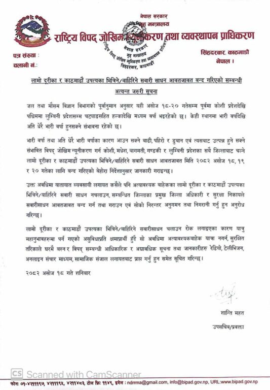 ‘भारी वर्षा तथा अति धेरै भारी वर्षाका कारण आउन सक्ने बाढी, पहिरो र डुबान एवम् त्यसबाट उत्पन्न हुने सक्ने सम्भावित विपद् जोखिम न्यूनीकरण गर्न कोसी, मधेस, बागमती, गण्डकी र लुम्बिनी प्रदेशका सबै जिल्लाबाट चल्ने लामो दूरीका र काठमाडौं उपत्यका भित्रिने/बाहिरिने सवारी साधन आवतजावत मिति २०८२ असोज १८, १९ र २० गतेका लागि बन्द गरिएको बेहोरा निर्देशानुसार जानकारी गराइन्छ ।’