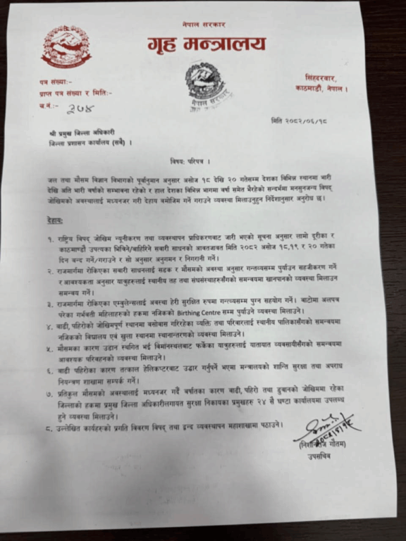 गृह मन्त्रालयले सबै पक्षलाई उच्च सतर्कता अपनाउन र विपद् न्यूनीकरणमा सक्रिय रहन आग्रह गरेको छ।