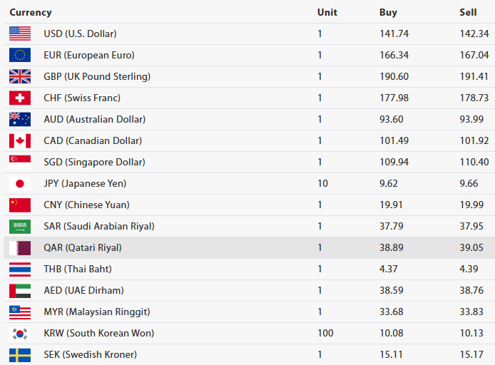 राष्ट्र बैंकले हङकङ डलर एकको खरिददर १८ रुपैयाँ २१ पैसा र बिक्रीदर १८ रुपैयाँ २९ पैसा, कुवेती दिनार एकको खरिददर ४६३ रुपैयाँ ३८ पैसा र बिक्रीदर ४६५ रुपैयाँ ३४ पैसा, बहराइन दिनार एकको खरिददर ३७५ रुपैयाँ ९८ पैसा र बिक्रीदर ३७७ रुपैयाँ ५७ पैसा, ओमनी रियाल एकको खरिददर ३६८ रुपैयाँ १४ पैसा र बिक्रीदर ३६९ रुपैयाँ ७० पैसा रहेको छ । भारतीय रुपैयाँ एक सयको खरिददर १६० रुपैयाँ र बिक्रीदर १६० रुपैयाँ १५ पैसा तोकेको छ ।
