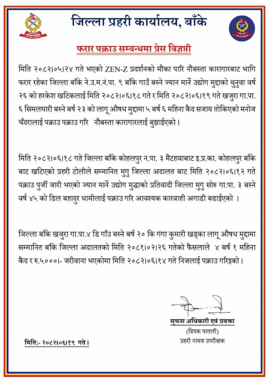 बाँके । जिल्ला प्रहरी कार्यालय बाँकेले विभिन्न अपराधमा फरार रहेका ४ जनालाई पक्राउ गरेको छ । पक्राउ परेकामध्ये दुई जना जेन जी आन्दोलनको मौकामा जेलबाट फरार भएकाहरू समेत छन् ।