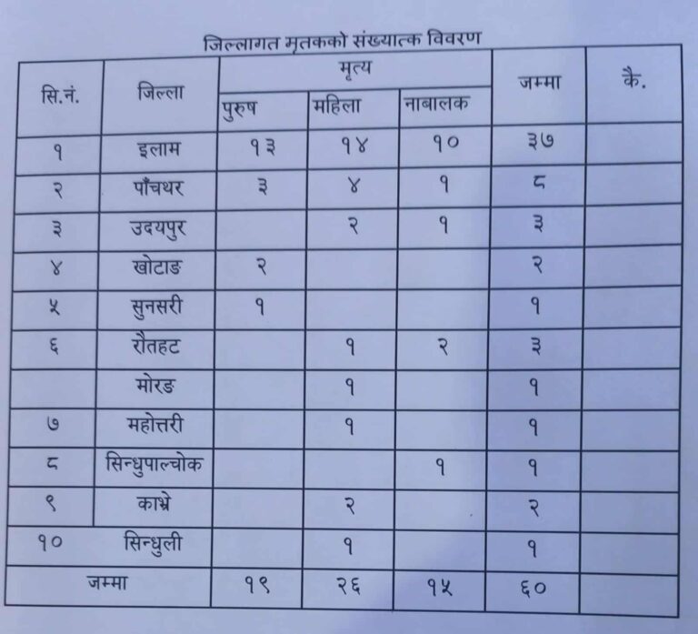सबैभन्दा धेरै इलाममा ३७ जनाको मृत्यु भएको छ । पाँचथरमा ८ जना, उदयपुरमा ३ जना, खोटाङमा २ जना, सुनसरी, मोरङ, महोत्तरी, सिन्धुली र सिन्धुपाल्चोकमा १–१ जना र काभ्रेपलाञ्चोकमा २ जनाको मृत्यु भएको छ ।