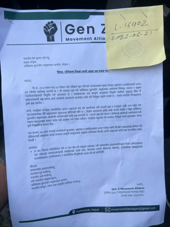 काठमाडौं । जेनजी युवाहरूको एक समूहले आज (मंगलबार) बिहान प्रमुख आयुक्त प्रेमकुमार राईसहित अख्तियार दुरुपयोग अनुसन्धान आयोगका सबै आयुक्तको राजीनामा माग्दै अख्तियारकै कार्यालयमा दबाबपत्र बुझाएका छन् । आज बिहान आयोगको टंगालस्थित कार्यालय पुगेर उनीहरूले ‘जेन–जेड मुभमेन्ट अलायन्स’को नाममा दबाबपत्र बुझाएका हुन् ।