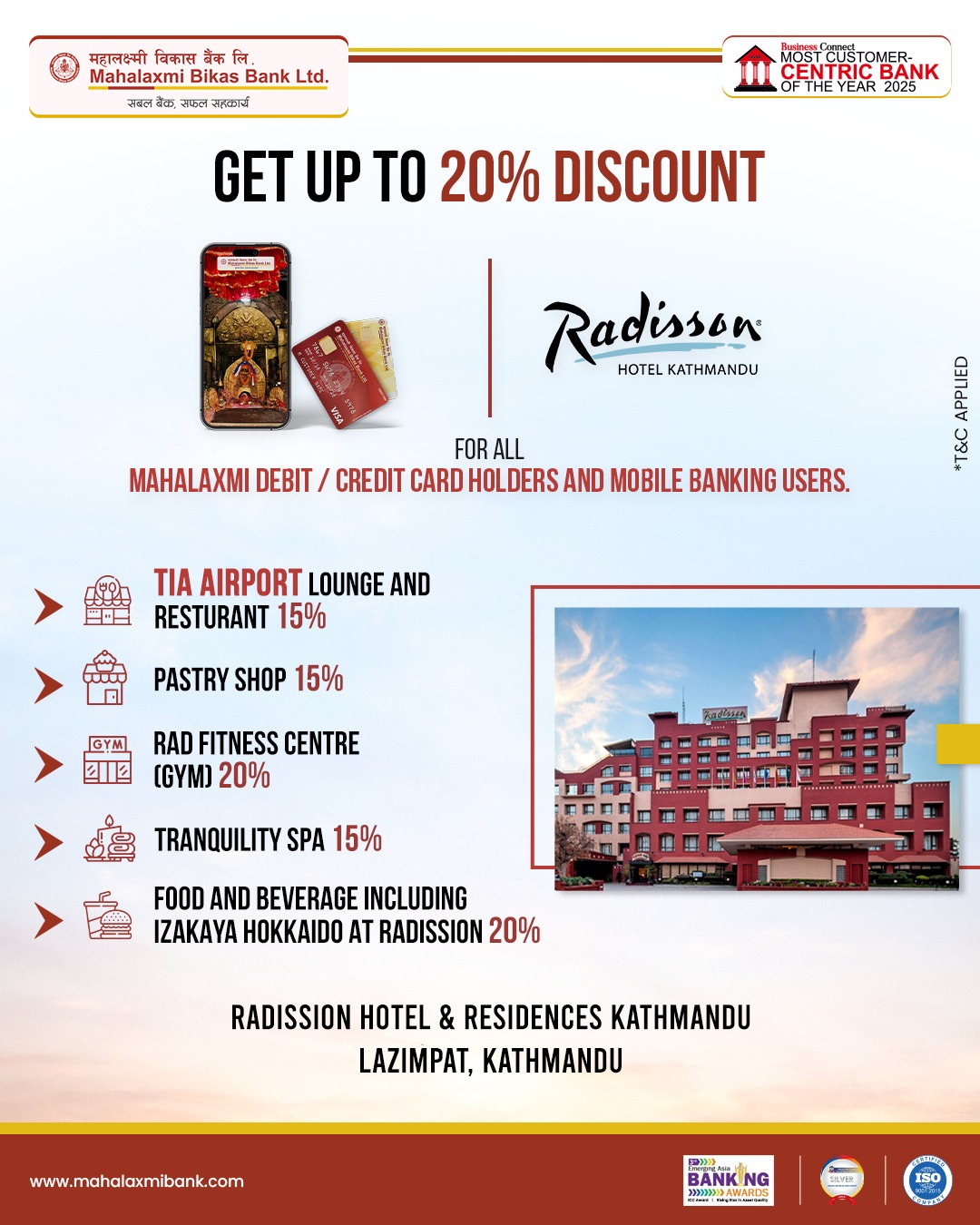 त्रिभुवन अन्तर्राष्ट्रिय विमानस्थलमा रहेको र्याडिसन एयरपोर्ट लाउन्ज सेवामा १५ प्रतिशत छुट, खाद्य तथा पेय पदार्थमा (इजाकाया होकाइडो होटल समेत) २० प्रतिशत छुट, पेस्ट्री खरिदमा १५ प्रतिशत छुट, ट्यानक्वीलीटी स्पा सेवामा १५ प्रतिशत छुट तथा र्याडिसन फिटनेस सेन्टर (जिम) का खाद्य तथा पेय पदार्थमा २० प्रतिशत छुट रहने व्यवस्था गरिएको छ।