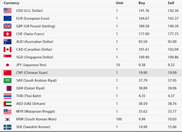 राष्ट्र बैंकले हङकङ डलर एकको खरिददर १८ रुपैयाँ २२ पैसा र बिक्रीदर १८ रुपैयाँ ३० पैसा, कुवेती दिनार एकको खरिददर ४६४ रुपैयाँ ०३ पैसा र बिक्रीदर ४६५ रुपैयाँ ९९ पैसा, बहराइन दिनार एकको खरिददर ३७६ रुपैयाँ र बिक्रीदर ३७७ रुपैयाँ ५९ पैसा, ओमनी रियाल एकको खरिददर ३६८ रुपैयाँ १९ पैसा र बिक्रीदर ३६९ रुपैयाँ ७५ पैसा रहेको छ । भारतीय रुपैयाँ एक सयको खरिददर १६० रुपैयाँ र बिक्रीदर १६० रुपैयाँ १५ पैसा तोकेको छ ।