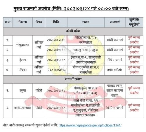 त्यसैगरी, मेची राजमार्ग अन्तर्गत इलाम नगरपालिका–९ राजदुवालीलगायतका स्थानहरूमा समेत सडक अवरुद्ध छन् भने तमोर करिडोर अन्तर्गत पाँचथरको तुम्वेवा गाउँपालिका–२ नावाखोला सडक पनि बन्द भएको जनाइएको छ ।