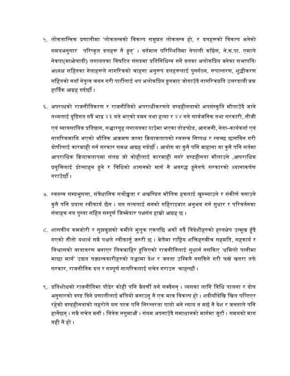 ‘लोकतान्त्रिक प्रणालीमा लोकतन्त्रको विकल्प सम्मुन्नत लोकतन्त्र हौ र दलहरुको विकल्प समयअनुसार परिष्कृत दलहरु नै हुन् । वर्तमान परिस्थितिमा नेपाली कांग्रेस, नेकपा एमाले, नेकपा माओवादी केन्द्र लगायतका विघठित संसदमा प्रतिनिधित्व गर्ने दलका अलोकप्रिय बनेका सभापति एवं अध्यक्षसहितका नेताहरुले नागरिकको चाहना अनुरुप दलहरुलाई पुनगर्ठन, रुपान्तरण, शुद्धीकरणसहितको नयाँ नेतृत्व चयन गरी पार्टीलाई थप अलोकप्रीय हुनबाट जोगाउँदै नागरिकप्रति उत्तरदायी बन्न हार्दिक आग्रह गर्दछौँ,’ जारी विज्ञप्तिमा भनिएको छ ।