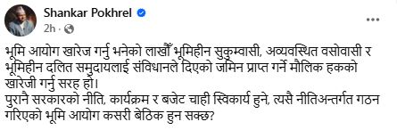 महासचिव पोखरेलले पुरानो सरकारले बनाएको नीति, कार्यक्रम र बजेट अझै स्वीकार्य रहेको भन्दै त्यही नीति अनुसार गठन भएको भूमि आयोगलाई खारेज गर्नु उचित बताए ।