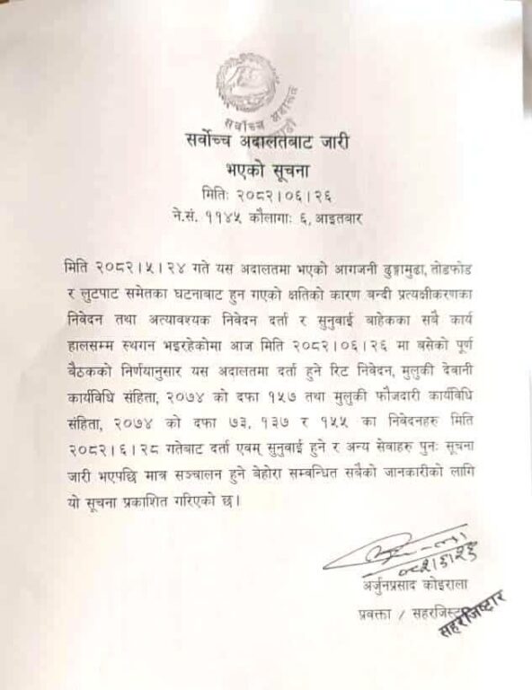‘यस अदालतमा दर्ता हुने रिट निवेदन, मुलुकी देवानी कार्यविधि संहिता, २०७४ को दफा १५७ तथा मुलुकी फौजदारी कार्यविधि संहिता, २०७४ को दफा ७३, १३७ र १५५ का निवेदनहरु मिति २०८२–६–२८ गतेबाट दर्ता एवं सुनुवाई हुने र अन्य सेवाहरु पुनः सूचना जारी भएपछि मात्र सञ्चालन हुने बेहोरा सम्बन्धित सबैको जानकारीको लागि यो सूचना प्रकाशित गरिएको छ,’ जारी विज्ञप्तिमा भनिएको छ ।