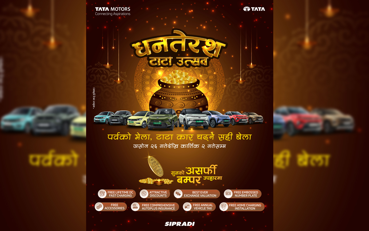 काठमाडौं । टाटा मोटर्सका लागि नेपालको एकमात्र आधिकारिक वितरक सिप्रदी ट्रेडिङ प्रालिले ‘धनतेरस टाटा उत्सव’ को सुरुवात गरेको छ ।