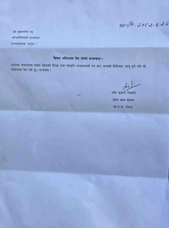 पत्रमा तिवारीले लेखेकी छन्, ‘मधेस प्रदेशको शिक्षा तथा संस्कृति मन्त्रालयको पदबाट आजकै मितिदेखि लागू हुने गरी यो राजीनामा पेस गर्दछु।’