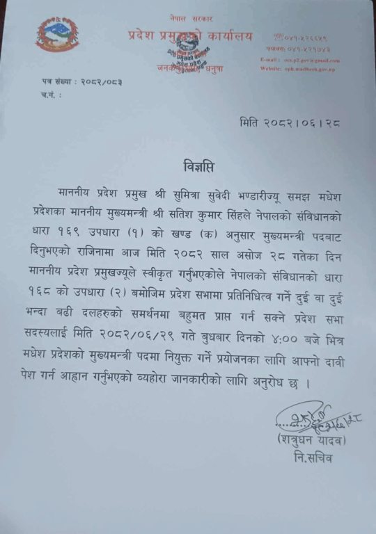 आजै प्रदेशका मुख्यमन्त्री सतिश कुमार सिंहले विश्वासको मत लिनुपर्ने दिनमा सदनमै राजीनामा दिएका थिए । उनका राजीनामापछि प्रदेशमा सरकार गठनको प्रक्रिया सुरु भएको हो ।
