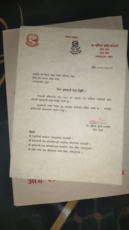 काठमाडौं । मधेस प्रदेशको मुख्यमन्त्रीमा लोकतातन्त्रिक समाजवादी पार्टी (लोसपा) का प्रदेश सांसद जितेन्द्र प्रसाद सोनार (सोनल) नियुक्त भएका छन् ।