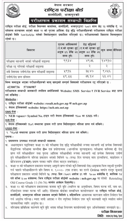 बोर्डका अनुसार पुराना आंशिकतर्फका ९ हजार ९३४ विद्यार्थीमध्ये ५ हजार ९१६ जना उत्तीर्ण भएका छन्। त्यसैगरी ग्रेड वृद्धितर्फ ४ हजार ९७६ जनाले परीक्षा दिएकामध्ये ३ हजार ५४० जना उत्तीर्ण भएका छन्।