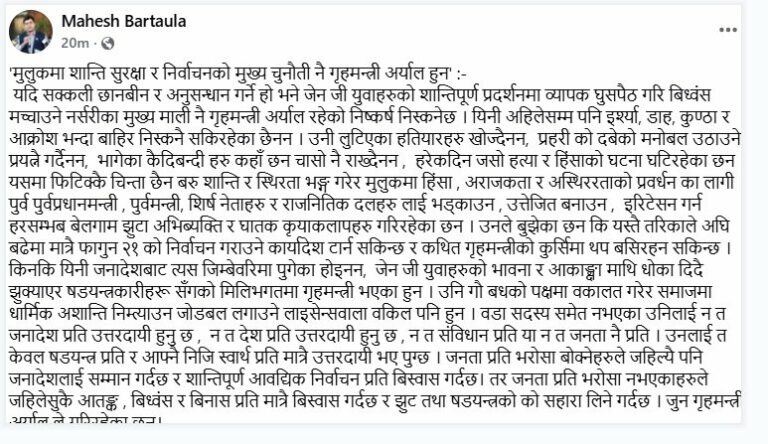 महेश बर्तौलाको आरोप : ‘निर्वाचनको मुख्य चुनौती गृहमन्त्री अर्याल हुन्’