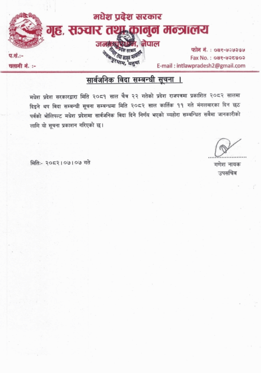 मधेस प्रदेशको गृह, सञ्चार तथा कानून मन्त्रालयले शुक्रबार एक सूचना जारी गर्दै कात्तिक ११ गते मंगलबारका दिन सार्वजनिक बिदा दिने निर्णय भएको जानकारी गराएको हो।