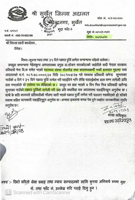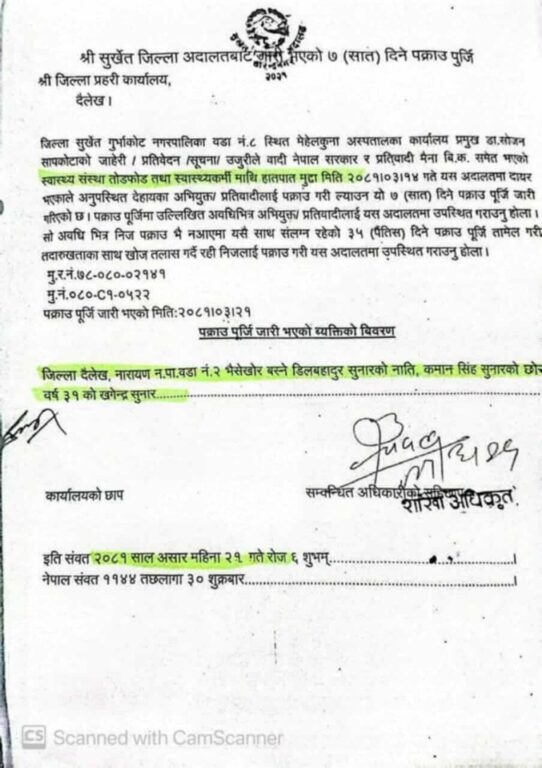 त्यसबेला सुनारमाथि सुर्खेतमा मेहेलकुना अस्पतालका प्रमुख डा. सोजन सापकोटामाथि हातपात तथा स्वास्थ्य संस्था तोडफोडको अभियोगमा पक्राउ पुर्जी जारी भएको थियो ।