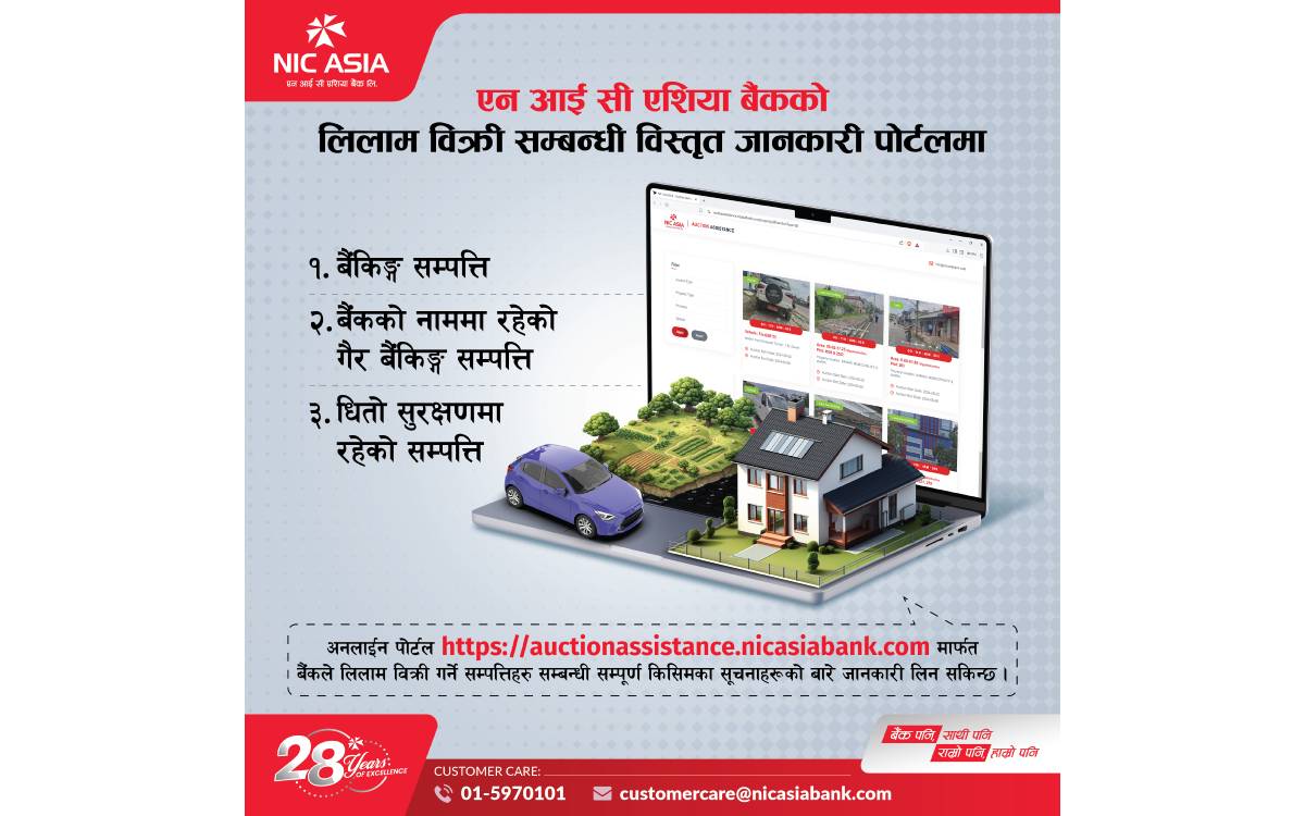 बैंकले सञ्चालनमा ल्याएको उक्त अनलाईन पोर्टलमा नियमित रुपमा बैंकिंक सम्पत्ति, गैर बैंकिंक सम्पत्ति तथा बैंकमा धितो सुरक्षण रही लिलाम बिक्रीमा रहेको सम्पत्तिहरु र लिलाम बिक्री सम्बन्धी अन्य सूचनाहरू प्रकाशित गरिने हुँदा खरिद गर्न इच्छुक ग्राहकहरूले अनलाईन पोर्टलको लिंक https://auctionassistance.nicasiabank.com बाटै बिक्री हुने सम्पत्तिहरुको विस्तृत विवरणहरू सहितको जानकारी लिई लाभ लिन सक्नुहुने बैंकले विश्वास लिएको छ ।