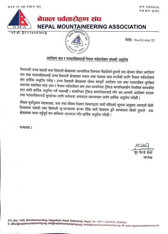 ‘उच्च हिमाली क्षेत्रहरुमा रहेका सम्पूर्ण आरोहण दल तथा पदयात्रीहरु सुरक्षित स्थानमा एकत्रित भएर रहन र नेपाल पर्वतारोहण संघ तथा सम्बन्धित ट्रेकिङ कम्पनीहरुश्रसँग नियमित सम्पर्कमा रहन हामी हार्दिक अनुरोध गर्न चाहन्छौँ,’ जारी विज्ञप्तिमा भनिएको छ,‘सम्बन्धित ट्रेकिङ कम्पनीहरुलाई पनि आ–आफ्नो आरोहण दलहरु तथा पदयात्रीहरुलाई सुरक्षाका लागि सतर्कता अपनाउन समन्वयका लागि हार्दिक अनुरोध गर्दछौँ ।’
