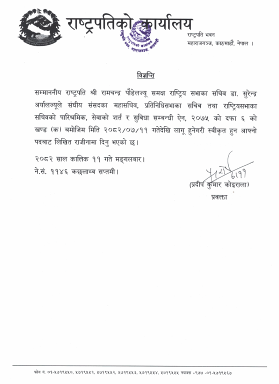 राष्ट्रपतिको कार्यालयका प्रवक्ता प्रदीपकुमार कोइरालाले जारी गरेको विज्ञप्तिअनुसार सचिव अर्यालले राष्ट्रियसभाका सचिवको पारिश्रमिक, सेवाको सर्त र सुविधासम्बन्धी ऐन २०७५ को दफा (६) को खण्ड ‘क’ बमोजिम आजैदेखि लागू हुने गरी राजीनामा स्वीकृत हुन पदबाट लिखित राजीनामा दिएको जनाइएको छ ।