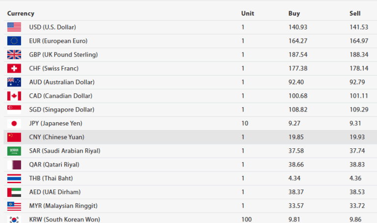 काठमाडौं । नेपाल राष्ट्र बैंकले आजका लागि विदेशी मुद्राको विनिमयदर निर्धारण गरेको छ । राष्ट्र बैंकका अनुसार अमेरिकी डलर एकको खरिददर १४० रुपैयाँ ९३ पैसा र बिक्रीदर १४१ रुपैयाँ ५३ पैसा निर्धारण गरिएको छ ।