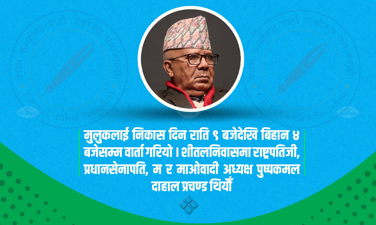 ‘जुन दिन के हुन्छ, के हुन्छ देशको अवस्था फेरिएर प्रतिगामीहरु फर्किएर आउने हुन् कि भन्ने चिन्ता व्याप्त थियो, विदेशीहरुको खेल मैदान मुलुक बन्ने हो कि भन्ने चिन्ता व्याप्त थियो । त्यस्तो बेलामा हामीलाई याद गरे, सम्झना गरे, बोलाए, राति ९ बजेदेखि बिहान ४ बजेसम्म हामी राष्ट्रपति भवनमा थियौँ । त्यहाँ को थिए ? राष्ट्रपतिजी हुनुहुन्थ्यो, प्रधानसेनापति थिए, म थिएँ र माओवादी केन्द्रका अध्यक्ष प्रचण्डजी थिए । कांग्रेसलाई बोलाइएको थियो, आएन । एमालेलाई बोलाइएको थियो आएन । देशका ठूला भनिएका दुई वटा शक्तिहरु छैन,’ नेपालले भने ।