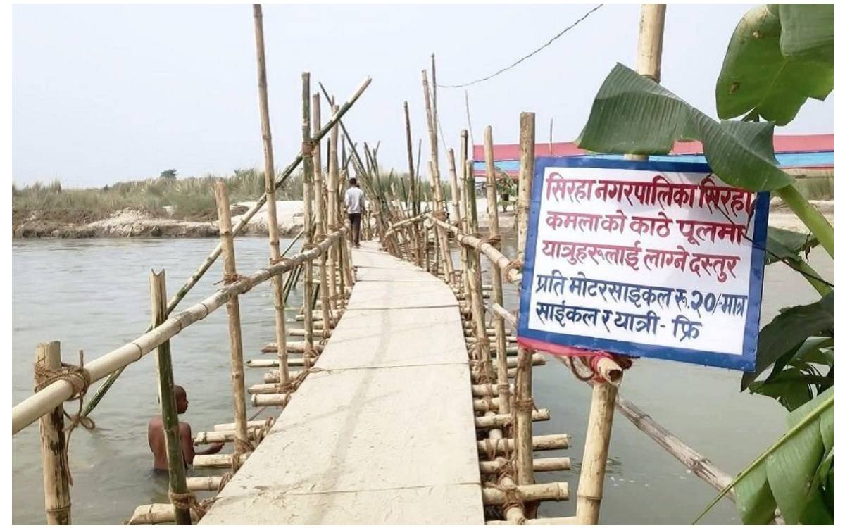 काठमाडौं । हुलाकी राजमार्गअन्तर्गत सिराहा र धनुषालाई जोड्ने कमला नदीमा पुल निर्माण सुरु भएको १४ वर्ष बितिसक्दा पनि काम अलपत्र छ । पुल नबन्दा सिराहा र धनुषावासी नदी तर्नका लागि स्थानीय युवाको सक्रियतामा बनाइएको कामचलाउ काठे पुलको सहारा लिन बाध्य छन् । यही काठेपुल तरेबापत स्थानीयले प्रतिव्यक्ति रु २० शुल्क तिर्नुपरेको छ ।