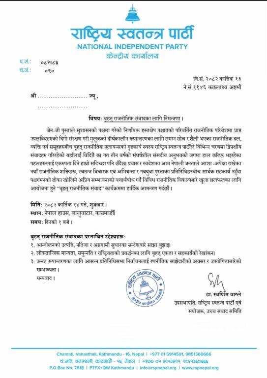 पार्टी उपसभापति एवं उच्च संवाद समितिका संयोजक समेत रहेका डा. स्वर्णीम वाग्लेले विज्ञप्ति जारी गर्दै नयाँ शक्तिहरुलाई वार्तामा आउन आह्वान गरेका हुन् ।